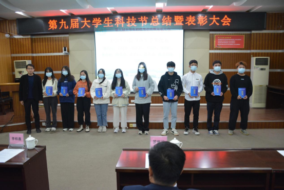 会议首先观看第九届大学生科技节活动总结视频。李桂鑫宣读了《关于表彰第九届大学生科技节先进集体和个人的决定》,本届大学生科技节共有244支队伍获奖,总计840人次;其中获得特等奖2队,共16人次;一等奖30队,共93人次;二等奖58队,共197人次;三等奖94队,共356人次;优秀奖60队,共178人次。随后黄淯斌为大学生科技节各竞赛项目获奖学生代表颁发获奖证书;李桂鑫为优秀指导老师颁发获奖证书;罗恢远为师范教育系、生物工程系、经济管理系颁发优秀组织奖。优秀组织奖获奖单位代表生物工程系副主任向亚林在会上作交流发言。